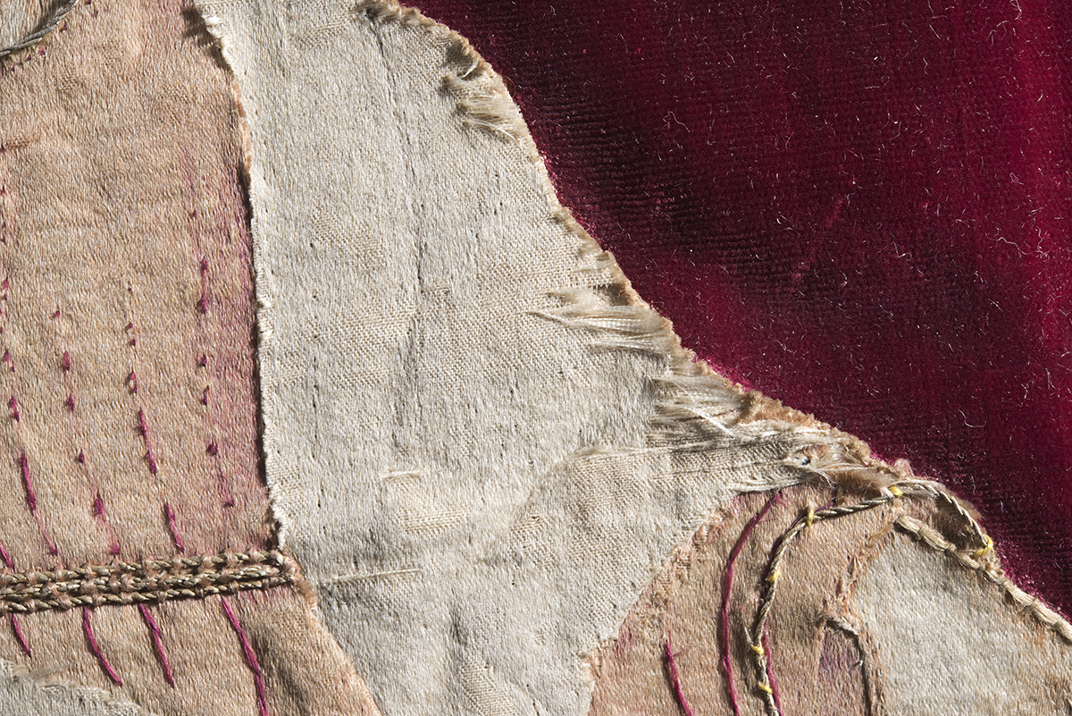 San Bartolomeo, patrono dei Bisilieri, chiude questo lato del baldacchino affiancando i Salaroli. La raffigurazione del santo non presenta caratteristiche di rilievo. Stringe il coltello del martirio e con l’altra mano sostiene un libro poggiato alla coscia. Molto sciupato nelle finiture, presenta però un volto in cui il ricamo conserva una sua funzione portante rispetto al disegno. Gli originali fili di seta a fingere i baffi e il contorno degli occhi, torneranno utili più avanti, quando proveremo a definire la cultura dell’anonimo pittore che ha lavorato alle “basi” che saranno poi ricamate. Come dei cartoni, realizzati però sulla seta e che non servono da spolvero, ma da fondi autentici per il ricamatore. Ancora una volta osserviamo il forte senso di realismo che il pittore ottiene ombreggiando appena le dita piegate a stringere il coltello.