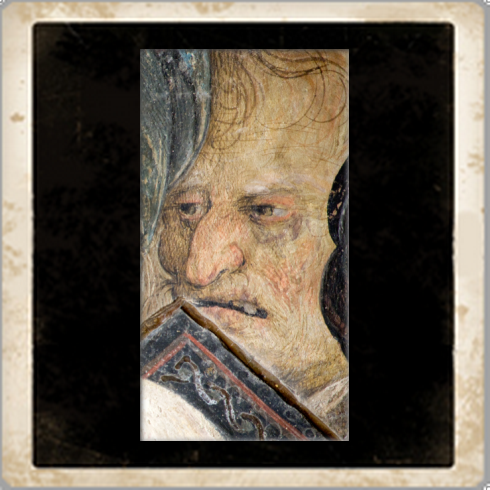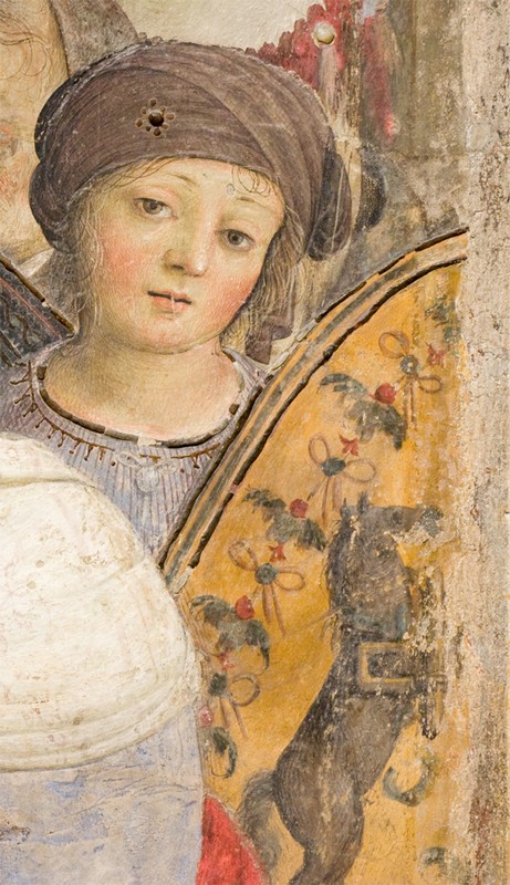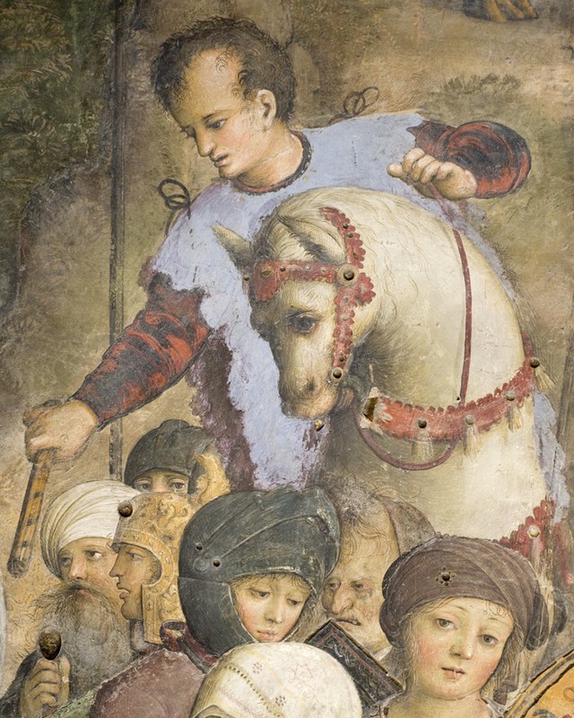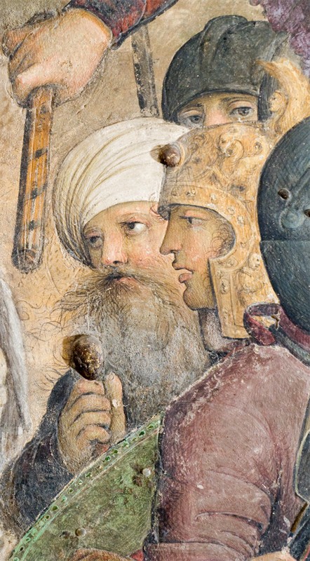 Sul lato destro guardando il dipinto, altri personaggi, alcuni protetti da scudi, sono sormontati da un cavaliere. In primo piano è raffigurata una vecchia, con il capo avvolto in uno scialle dal tessuto prezioso, anche se appare molto sciupato. Alla sua tunica rossa si stringe un bambino, visto di spalle, con le cosce nude. Con la galleria di immagini che presentiamo vorremmo aiutare a cogliere le capacità ritrattistiche e l'attenzione per le vesti, un tempo impreziosite da decori a rilievo.