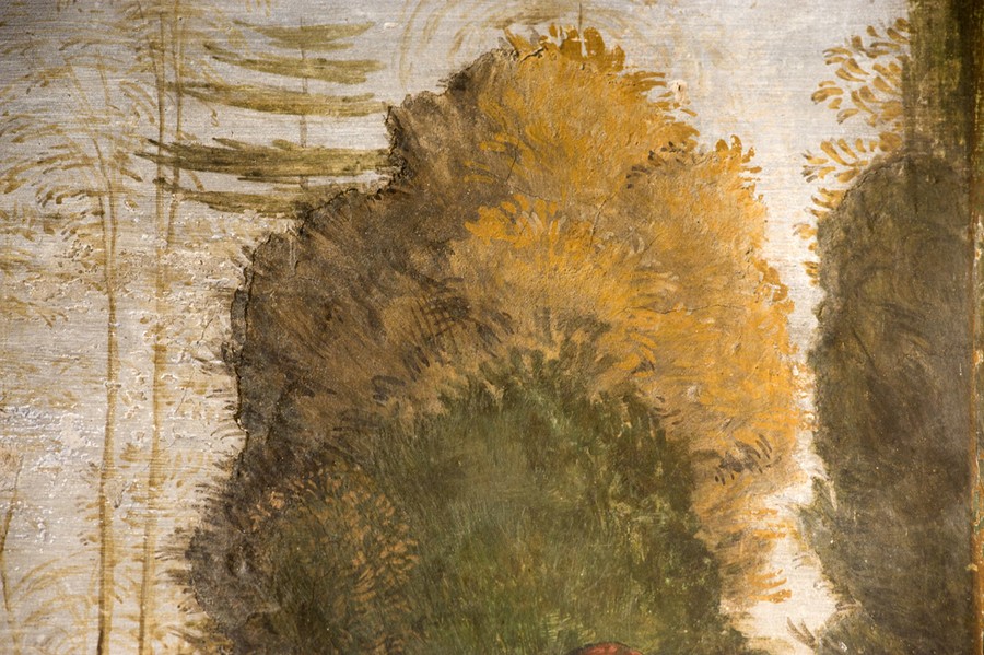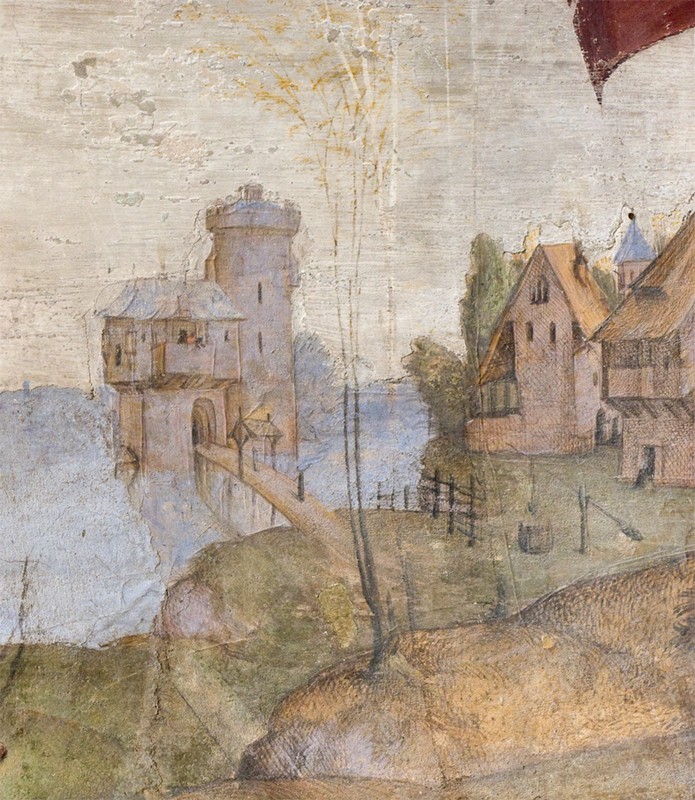 Sul fondo, tanto a destra che a sinistra, troviamo ancora una volta protagonista l'umanità nella sua quotidianità. Sono personaggi che non sempre riusciamo a identificare, ma che certamente rivestivano un ruolo specifico nell'economia del racconto che non è stato ancora approfondito. Si muovono sullo sfondo di una natura rigogliosa, vagamente autunnale, ordinata dal lavoro dell'uomo.