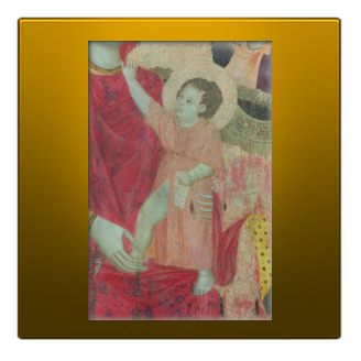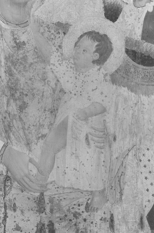 Le riprese fotografiche con diversi filtri (IR, UV, falso colore) consentono una lettura comparata dei dati. Emergono i ritocchi ed appare il disegno, in alcune parti di sicuro interesse. Si evidenziano i danni alla superficie dipinta e i numerosissimi ritocchi sopra parti precedentemente stuccate o a “velare” parti abrase. Le sottostanti immagini ad alta definizione del particolare a luce radente e ad infrarossi consentiranno a tutti di apprezzare danni e qualità del disegno soprattutto sulle mani della Vergine e il piede sinistro del Bambino.