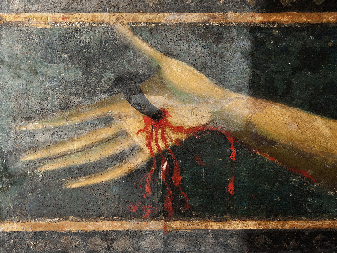 Quanto alla presunta cromia scurissima che è stata notata dalla critica, bisogna rilevare che essa è la conseguenza dell’attuale stato di conservazione. Immaginandola privata della spessa vernice coprente che fa da schermo anche ai raggi UV e ritrovata la squillante alternanza di azzurro brillante (al momento non conosciamo ancora la sua composizione chimica) al verde smeraldo sui rombi del tabellone, recupereremo di molto le analogie con le altre opere del gruppo. La vernice coprente non è il solo film che si frappone alle cromie originarie. Il dipinto è stato ritoccato quasi per intero in epoca molto antica. Questa pittura stesa sopra l’originaria, ha poi subito un’alterazione a causa di una fonte di calore che ha virato la cromia e ridotto in grumi questa stesura. Sulla mano destra del Cristo, ove si è provato a rimuovere gli strati superficiali, appare il blu intenso della croce e l’incarnato del maestro, in foto non del tutto apprezzabile perché la ripresa è stata eseguita in un momento della pulitura che accentua l’aridità della materia sottostante. Effetto che sarà mitigato durante il proseguimento dell’intervento.