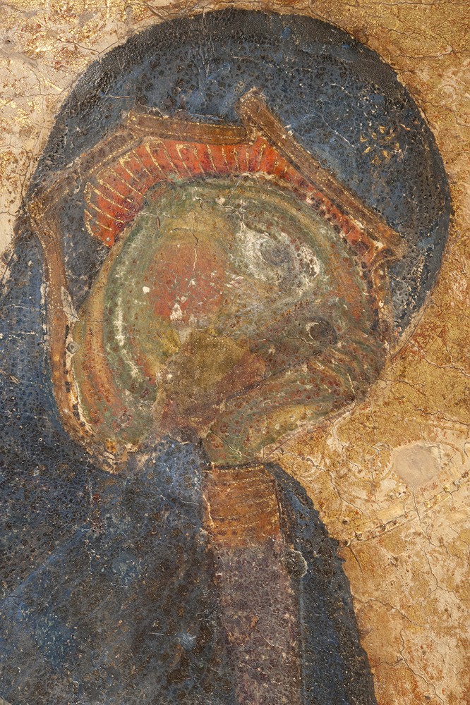 La Vergine è raffigurata con una mano alla guancia e l’altra al petto che indica il Cristo in Croce. La mano portata alla guancia, quasi a sostenere il volto è il segno della Vergine Addolorata sotto la croce. Con la mano al petto essa indica il Cristo condividendo il suo dolore con tutta l’umanità, ma indicando altresì il valore salvifico del “sacrificio” del Figlio. È uno dei “modelli” usati dal nostro maestro per la figura della Vergine accanto alla croce. A Faenza la Vergine ha entrambe le mani coperte dalla tunica e accostate al volto. È un altro modello noto in oriente e utilizzato per questa raffigurazione. L’immagine ha molto sofferto per via delle traversie che hanno riguardato il dipinto. Il restauro in corso fa riemergere parte di questa storia e con essa qualche altro dato sull’opera.