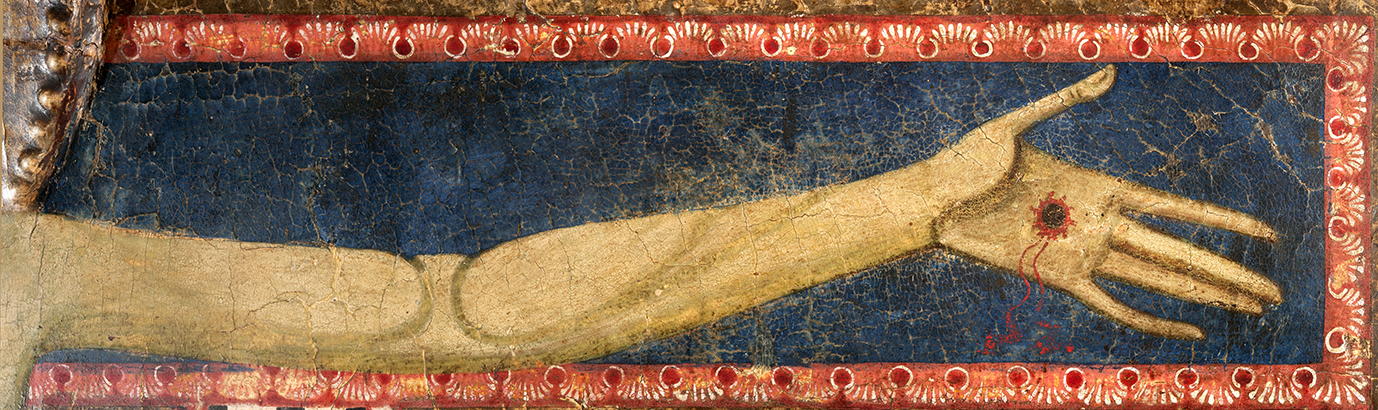 La figura del Cristo crocifisso nell’opera a Fabriano presenta il ventre bipartito e nella croce bolognese il ventre tripartito. Una variante apparentemente marginale eppure evolutiva nell’iconografia della croce dipinta nel corso del XIII secolo. Per tutta la prima metà del secolo il modello del Crocifisso presenta il ventre tripartito. Lo stesso Giunta Pisano, un’eccellenza tra i pittori di questo momento, arriva a raffigurare il Cristo con il ventre bipartito solo nell’ultima sua opera nota: il crocifisso di san Ranierino a Pisa. Credo che il percorso culturale che ha segnato tutti i pittori del tempo abbia riguardato anche il nostro Rinaldo di Ranuccio che muovendo da modelli a lui noti e certamente più comuni, approda infine all’opera con il ventre bipartito di Fabriano che pertanto va considerata, con ogni probabilità successiva al dipinto bolognese.