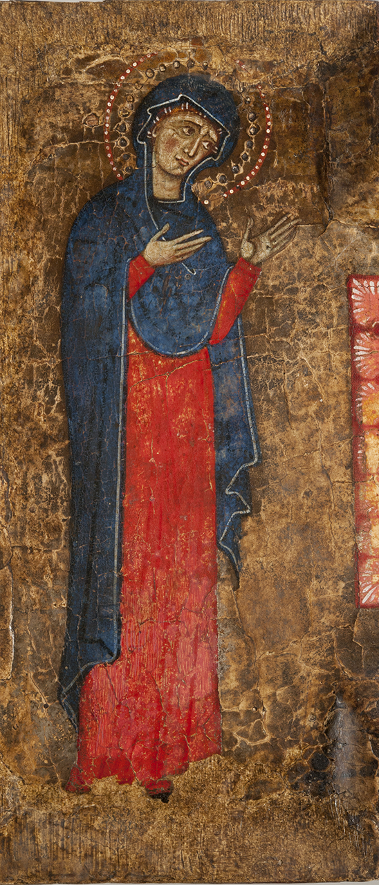 nella croce posta davanti a questa di Rinaldo di Ranuccio, che è custodita nella chiesa di san Francesco a Bologna torna l’iconografia mariana con una mano al petto che indica la croce e l’altra al volto a sottolineare il dolore e lo sconforto della Vergine