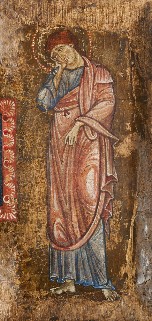 La storia del crocifisso dipinto nel XIII secolo segue una evoluzione della forma che sembra aver riguardato, in maniera indipendente, tutti i pittori del tempo. Ci sono poi varianti canoniche nell’atteggiamento della Vergine sul tabellone laterale. Le mani sono alle volte coperte dal mantello, tal altra portate al petto e alla guancia, sempre in atteggiamento di dolore per la morte del Figlio. Probabilmente inconsapevolmente gli artisti ripetono “modelli” che l’oriente cristiano ha elaborato in particolari territori dell’impero e che sono diventati patrimonio comune e ormai indistinto. Ed è forse così che può essere accettata anche la particolare immagine della Vergine che Rinaldo di Ranuccio propone sulla croce oggi a Bologna. Un’immagine che non è canonica ai lati della croce, ma appartiene ad un altro “modello”, quello della Vergine che intercede presso Cristo (detta anche Hagiosoritissa. Termine che indica soltanto una provenienza topografica del modello originario - Hagia Soros),. E che si caratterizza per la posizione delle mani, entrambe rivolte verso il Cristo in un atteggiamento caratteristico di una figura che indica o chiede. Un atteggiamento operoso, diverso dall’immagine addolorata con almeno una delle mani accostata al volto. È anche segno distintivo della raffigurazione della Deesis, rappresentazione con il Cristo al centro e lateralmente la Vergine e san Giovanni, entrambi con le due mani volte verso il Cristo a indicarne la natura umana e divina. Posta sul tabellone laterale di una crocifissione, mentre san Giovanni mantiene l’atteggiamento tipico del “dolore” pare più una contaminazione, la ripresa di un motivo non percepito nella sua valenza semantica e semplicemente barattato come una variante della Madonna “addolorata” sotto (accanto) alla croce. Una contaminazione che si giustifica solo in una periferia culturale che non ha piena consapevolezza dei significati che assumono le figure nell’ortodossia cristiana. Nell’altra croce, a Fabriano, Rinaldo di Ranuccio propone invece un modello mariano del tutto ortodosso. Può essere anche questo il segno di una “maturità” del linguaggio pittorico del maestro del tutto rientrato nei canoni dell’ortodossia.