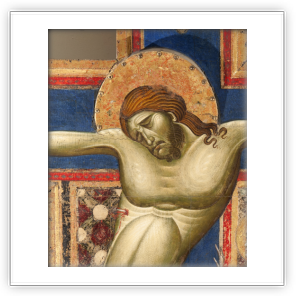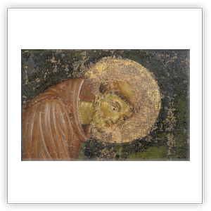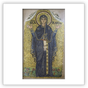 Il “modello” mariano è riconducibile alla Vergine Platytera, “Madre di Dio del Segno” che, nell’originaria effigie è completata dal Figlio, raffigurato in un medaglione o “uovo cosmico” su fondo oro, posto all’altezza del seno della Madre, ad indicare il mistero dell’Incarnazione del Verbo. La Vergine Platytera vuole essere anche immagine della Chiesa che accoglie in se il Verbo incarnato e lo rivela all’umanità . L’immagine di Maria sulla nostra croce, sostituisce il Logos racchiuso nell’uovo cosmico con il Cristo in Croce che, analogamente a quanto accade nella Vergine Blachernitissa apre le mani anch’esso, e diventa simbolo, non “il crocifisso”, ma corpo e il sangue di Cristo. Un concetto sottolineato dalla Vergine Platytera che lo annuncia fiancheggiata dagli arcangeli a simboleggiare anche la Chiesa che mostra e custodisce il Corpus Domini: Annuncio e custodia sul petto della Madre Chiesa.