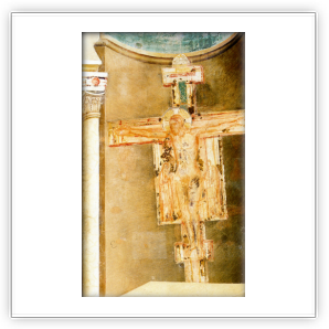 Un giorno passò davanti alla chiesa di san Damiano, quasi in rovina e abbandonata da tutti. Condotto dallo Spirito, entra a pregare, so prostra supplice e devoto davanti al crocifisso e, toccato in modo straordinario dalla grazia divina, si ritrova totalmente cambiato. … all’improvviso – cosa da sempre inaudita – l’immagine di Cristo crocifisso, dal dipinto, gli parla movendo le labbra. “Francesco – gli dice chiamandolo per nome – va’, ripara la mia casa che, come vedi, è tutta in rovina” (cap. VI, 593)