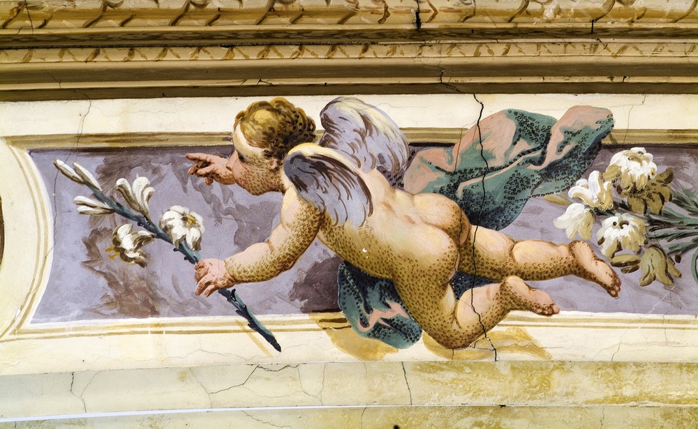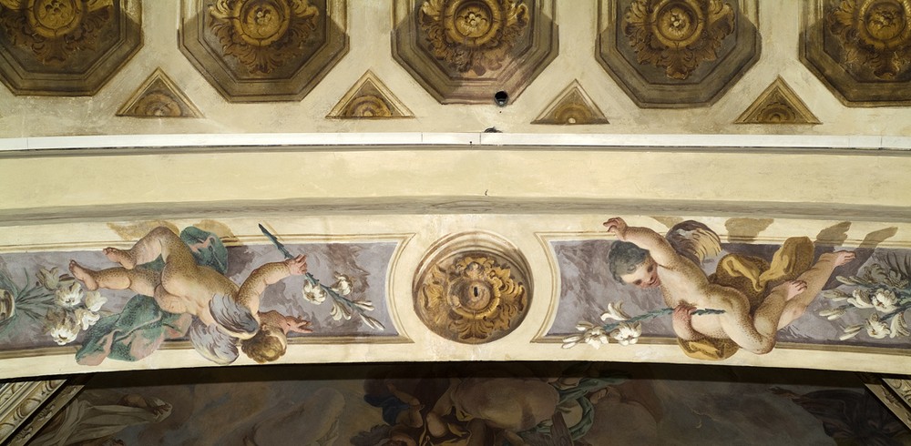 La virtù segue, anche se in modo semplificato, la descrizione di Cesare Ripa: s’appoggia questa donna ad una colonna, perché delle parti dell’Edificio questa è la più forte, che l’altre sostiene, a’ piedi di essa figura vi giacerà un Leone animale da gli Egizi adoperato in questo proposito, come si legge in molti Scrittori (3) .