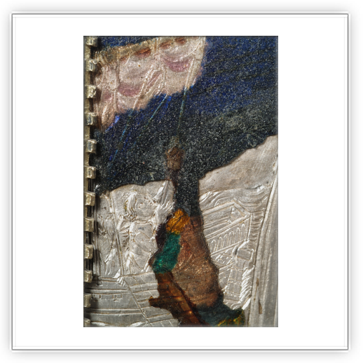 Durante l’impero di Teodosio II, che secondo la “leggenda” medievale aveva sposato la sorella di Petronio, l’oriente è scosso dall’eresia ariana. L’imperatore invia Petronio a Roma perché conferisca con il Papa e lo accompagna al porto ove “… appresso la nave, .. li de’ la benedictione soa, diandoli paxe per bocca …”. L’episodio è perfettamente rappresentato in questa formella (l’originale misura cm. 6,4 x 6,4 x 0,13) che si caratterizza per le due figure affrontate che si abbracciano mentre i marinai già dispiegano le vele. L’abbraccio è colto proprio sul molo mentre una nave è ormai pronta a salpare e i marinai stanno sciogliendo le vele. Non a caso il Santo che parte è raffigurato a ridosso della passerella che corre tra la nave e la terraferma. Notiamo ancora, a riprova dell’attenzione iconografica che contraddistingue l’intero ciclo, che Petronio non indossa ancora la mitra vescovile, insegna che deve ancora ricevere.