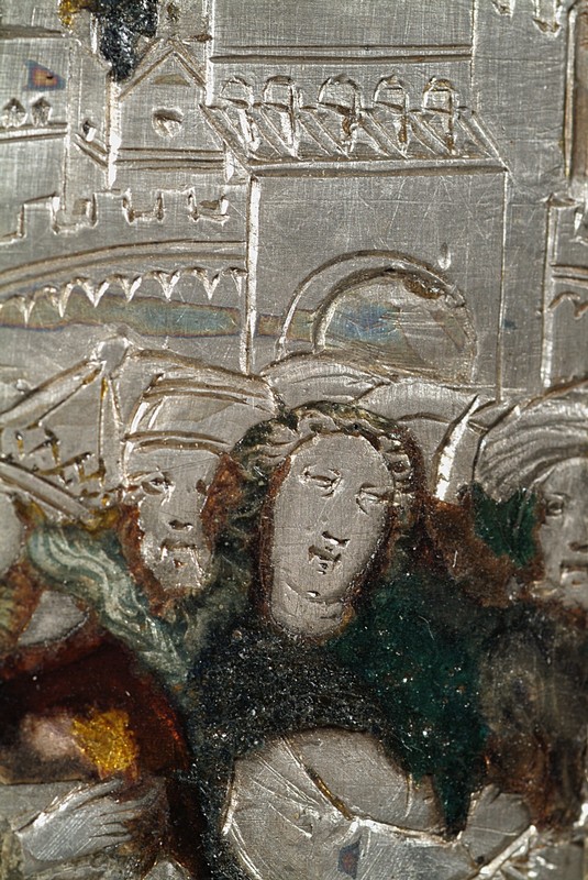 A destra dietro le due figure principali si assiepano i dignitari della corte tra i quali emerge, magnifico, un personaggio femminile elegantemente vestito. Una figura alla quale è riservato uno spazio significativo nell’economia della narrazione così che ci chiedevamo se non fosse possibile vedere la stessa sorella di Petronio