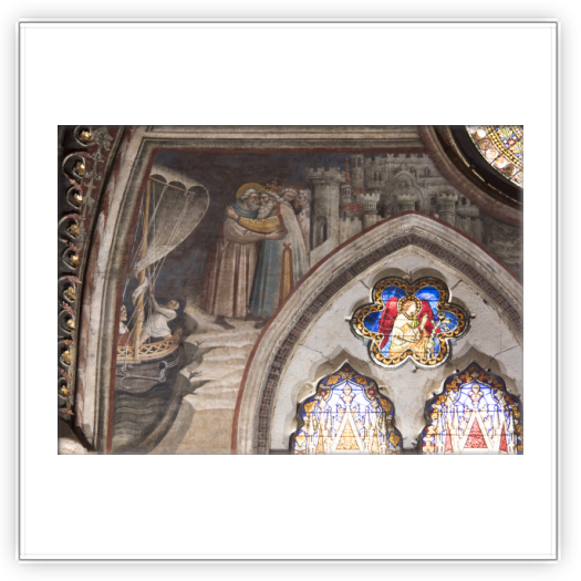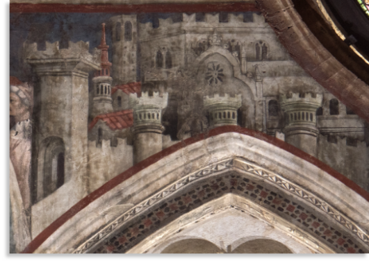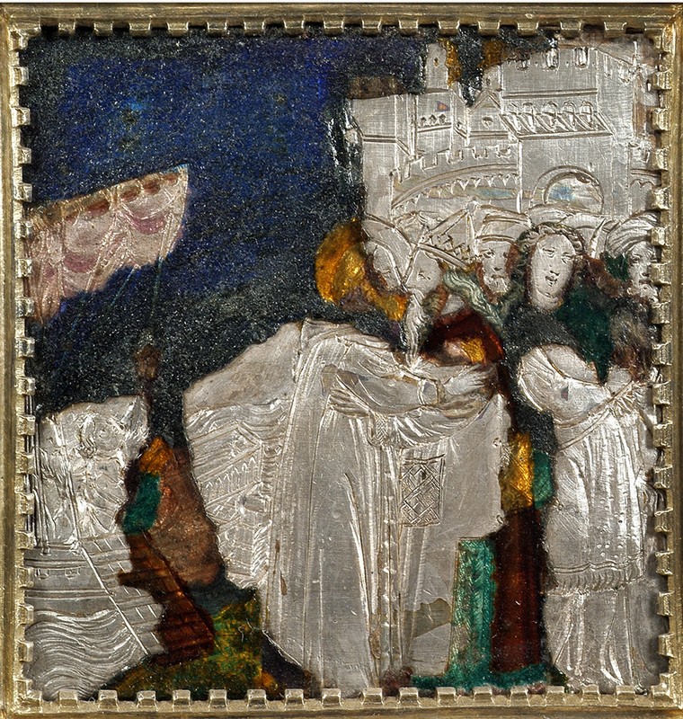 La “storia” è ripresa in maniera puntuale nell’analoga raffigurazione affrescata sulla parete di fondo della cappella Bolognini. Un confronto molto preciso che va dall’organizzazione della scena al particolare abbraccio tra il santo e il sovrano, solo invertito per quel che riguarda la posizione delle braccia. Un confronto molto preciso che pone il problema di un rapporto culturale intercorso se non con l’orafo certo tra la sua opera e questo ciclo figurato che, sulla parete di fondo di questa cappella, illustra per la prima volta all’intera città i fatti salienti della vita di Petronio. Né è possibile escludere una terza ipotesi. Una fonte a noi sconosciuta a cui attingono entrambe le opere. Magari un ciclo affrescato nella chiesa di santo Stefano ove il culto verso il Santo e vivo almeno dal 1141, ma non documentato da alcuna opera fino al reliquiario di Jacopo Roseto. Un silenzio delle fonti figurate che è praticamente impossibile immaginare e che rende più che probabile l’esistenza di un ciclo dipinto che non ci è pervenuto.