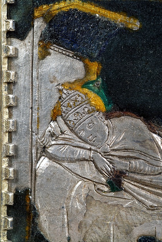 Celestino I, la notte che precede l’arrivo di Petronio a Roma, vede in sogno san Pietro che gli rivela la morte del vescovo di Bologna Felice e suggerisce il nome di Petronio quale vescovo per quella Chiesa. Il soggetto, raffigurato solo sul reliquiario e non nella cappella Bolognini, è descritto in entrambe le vite medievali di Petronio e segue la partenza del Santo da Costantinopoli. La composizione di Jacopo Roseto appare estremamente equilibrata, in linea con i più aggiornati sviluppi figurativi incarnati in città da Jacopo di Paolo. Si caratterizza per la linearità dello spazio architettonico, riquadrato superiormente dall’architrave della stanza e lateralmente dalla tenda laterale lasciata aperta a mostrare il pontefice che dorme. Un “ritratto” che tornerà utile per identificarlo in altre scene del reliquiario.