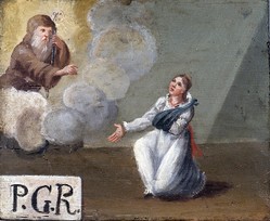 Donna guarita da un "flemone" Lugo - san francesco di Paola cm 35,5 x 25 datato 1862 | Sul verso la seguente iscrizione: Aprile 1862 Virginia Montanari nata Ricci=Giacomini d'anni 72 risanò da un flemone [flemmone] in ambe le mani che la tenne obbli- gata al letto per più di tre mesi con gravisismo pericolo di vita P.G.R.