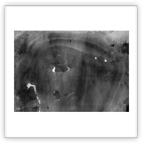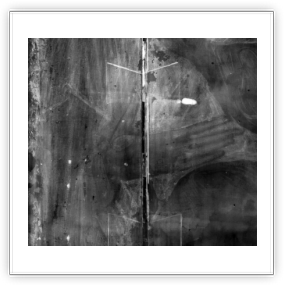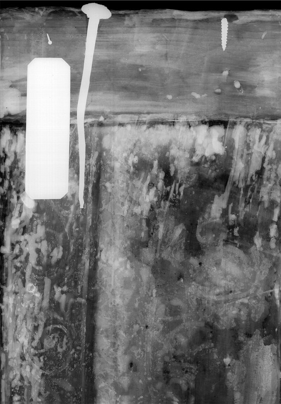 La radiografia si utilizza per individuare pentimenti, ridipinture, presenza di chiodi, gallerie di insetti, lo stato di conservazione del supporto, i metodi usati per tenere unite le tavole. La metodica è completamente non distruttiva. Questa indagine è stata di particolare utilità anche perché precedenti radiografie, eseguite negli anni ‘70 e al momento non rintracciate, avevano portato a supporre l’esistenza di un’immagine sottostante molto diversa da quella che vediamo. La lastra consente di leggere chiaramente le connessioni tra le tre tavole che costituiscono il supporto del dipinto e le fratture della tavola. I sistemi utilizzati per riunire le parti e i diversi interventi succedutesi nel tempo testimoniati da possibili cavicchi in legno, sicuramente i più antichi, e dai chiodi forgiati a mano che uniscono la barra traversa superiore alle tavole centrali. Altrettanto importanti quelli che sembrano, sul fondo e sul bordo del maphorion, delle lamine metalliche. Quasi certamente il fondo bugnato era rivestito da una sottile lamina metallica. L’esame di un frammento prelevato dal fondo sembra confermare la presenza della lamina che appare con una certa evidenza anche nelle macrofoto eseguite con microscopio digitale portatile. Una lamina metallica sembra essere presente anche sul bordo del maphorion che circonda il capo della Madre di Dio. Per quanto riguarda l’immagine emerge la sostanziale identità tra la radiografia e l’immagine visibile e diventano analoghi alcuni elementi che erano apparsi, in precedenti indagini, profondamente diversi. Esamineremo in dettaglio il volto della Madre di Dio. Qui basti far notare l’assoluta corrispondenza degli occhi, perfettamente documentabile grazie alla lumeggiatura posta accanto alla pupilla, radiopaca, e pertanto identica tanto nell’immagine visibile che nella radiografia. La somiglianza arriva alla perfetta sovrapponibilità delle due immagini confermata dalla medesima distanza interpupillare.