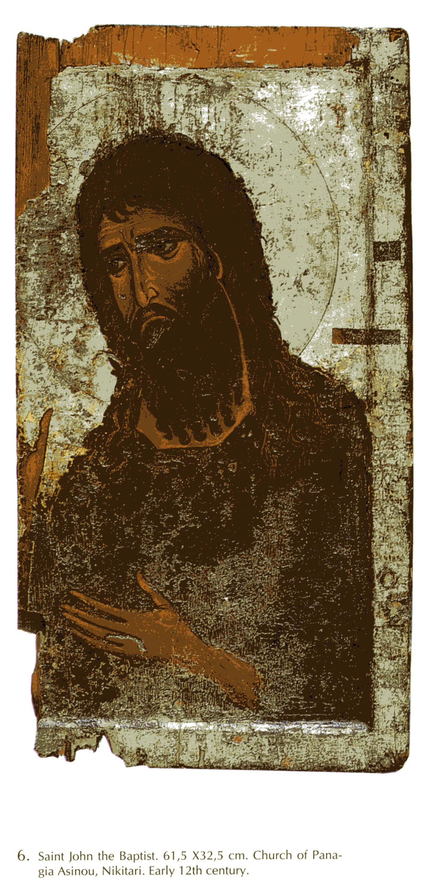 Nel 965 dC l'imperatore Niceforo Foca, abolito lo status particolare di Cipro, che era stato in vigore dal trattato di 688/689 tra Giustiniano II e Abd-al-Malek, annette Cipro all'Impero bizantino. Purtroppo non si sa nulla sulla pittura delle icone nel corso degli anni che seguirono, mentre la conoscenza della pittura murale si arricchisce ogni giorno con la scoperta di affreschi in diverse chiese. Molti affreschi del 11 ° secolo sono noti da poco tempo. L'unico reperto del secolo XI è un piccolo frammento di un'icona con più figure (fig. 5). Questo frammento proviene dalla Chiesa degli Arcangeli a Levkoniko ed è ora conservata nel Museo bizantino della Fondazione Arcivescovo Makarios III. Lo sfondo rosso dell'icona ha portato di recente a dubbi circa la datazione di questa icona al secolo XI, ma lo sfondo rosso era stato in uso per le icone portatili a partire dal secolo settimo. Uno sfondo rosso viene usato nel 11 ° secolo nella pittura murale di San Demetrio sul pilastro nord-est della chiesa di San Nicola tisStegis, che sta imitando un’icona portatile, in quanto sul telaio superiore della pittura murale è raffigurato un anello di sospensione. Nella stessa Chiesa la linea è abbastanza evidente su affreschi del secolo XI. Le figure degli apostoli del frammento Levkoniko sono più vicine, per quanto riguarda la modellazione e la tecnica, ad affreschi del secolo XI, nelle chiese di Sant’ Antonio a Kellia e San Nicola tis Stegis che agli affreschi del tardo 13 ° secolo nella Chiesa della Panagia tou Moutoulla. Gli affreschi della Chiesa di Panagia tou Moutoulla sono quasi monocromatici e altamente stilizzati. Alla fine del 11 ° secolo Cipro è rimasta l'unica base militare bizantino nel Mediterraneo orientale a causa della perdita dell'Asia Minore ai Seldjuks. E 'diventata più importante con l'inizio delle Crociate. Indicativo della sua importanza è il fatto che, dopo la soppressione della rivolta di Rapsomatis nel 1092 da Manuel Voutomytis, l'imperatore Alessio Comneno ha inviato a Cipro come governatore militare prima Philokalis e poi Costantino Katakalon, entrambi vicini all'imperatore. Durante il 12 ° secolo tutti i governatori di Cipro erano legati alla famiglia regnante in Costantinopoli. Durante questo periodo tutti i monasteri più importanti di Cipro che sono ancora funzionanti sono protetti. Alcuni di loro sono legati direttamente ai governatori poi di Cipro e altri sono stati costruiti con l'aiuto dello stesso imperatore. Il Monastero di Kykkos è stato fondato con l'aiuto di Alessio Comneno imperatore. Il monastero di San Crisostomo è in relazione con Eumathios Philokalis, che costruì al suo interno la Cappella della Santissima Trinità. Il Monastero di Machaeras è fondato con l'aiuto finanziario degli Imperatori Manouel Comneno e Angelos Isaakios. Inoltre, funzionari locali, come ad esempio Magistros Epiphanios Paschalis e Magistros Niceforo Ischyrios fondano Monasteri. Il primo fondò il Monastero delle Vergini Alypos, vicino Yeri, nel 1091, e il secondo il Monastero della Vergine Phorbiotissa, conosciuta come Asinou, probabilmente nel 1099. Il generale sopra esplicitato Manouel Voutomytis ha inviato icone al Monastero di Kykkos a Costantinopoli dopo aver omesso di inviare l'icona della Vergine Eleousa che era stata chiesta dal monaco Isaia. In seguito, secondo la tradizione, Isaia, con l'aiuto di Manuel Voutomytis, sono riusciti a portare a Cipro l'icona della Vergine di Eleousa Kykkos, che era stato tenuta nel palazzo dell'imperatore di Costantinopoli. Non solo, ma Isaia assieme ad altri monaci ciprioti si recavano a Costantinopoli per conoscere la pittura lì. Avrebbero visto affreschi e icone portatili nei monasteri dove abitavano e in altre Chiese di Costantinopoli. Essi hanno anche incontrato i pittori che lavoravano nei monasteri, dal momento che i monasteri erano i più importanti centri artistici. Inoltre, molti fondatori di chiese e monasteri a Cipro impiegavano pittori di Costantinopoli per la decorazione delle Chiese che stavano costruendo, per esempio Eumathios Philokalis e St. Neophytos. St. Neophytos occupato Apseudis Theodoros da Costantinopoli attraverso il vescovo di Pafos VasiLios Kinnamos, probabilmente un membro della famiglia ben nota Kinnamos di Constantinopoli. Questa esposizione all'arte della metropoli è l'unica spiegazione per l'alta qualità di affreschi e icone di alcune delle Chiese di Cipro dell’ 11 ° ed 12 ° secolo e al fiorire della pittura in generale a Cipro in questo periodo . E 'vero che solo alcune icone sopravvivono del 12 ° secolo e la maggior parte di esse sono datate all'ultimo quarto di questo secolo. Le icone sono state distrutte da incendi che sono scoppiati di volta in volta nei più importanti monasteri. La distruzione è dovuta anche alle incursioni di Renaud de Chatillon nel 1155 o 1156, della flotta araba d'Egitto nel 1158, della flotta del conte di Tripoli in 1161 e poi il saccheggio delle Chiese da Riccardo Cuor di Leone nel 1191 , i Templari nel 1192, i Genovesi nel 1373, i Mamelucchi nel 1425 e il 1426 e, infine, i Turchi che avevano occupato Cipro nel 1570. Non è, quindi, sorprendente che così poche icone sono giunte fino a noi. La prima icona del 12 ° secolo, che è sopravvissuta è l'icona di San Giovanni Battista (fig. 6) dalla Chiesa di Asinou. L'icona è una parte del Deisis, come è evidente dall'atteggiamento di San Giovanni. Lo stile dell'icona è strettamente legata allo stile degli affreschi della Chiesa di Asinou datato al 1105/1106 e la pittura murale di San Giovanni Battista dal Deisis nella cupola della Chiesa di Panagia a Trikomo . Lo sfondo di questa icona di San Giovanni Battista è coperta d'argento, non d'oro come di solito nelle altre icone conosciute del 12 ° secolo. Il linearismo relativa, senza una linea di disegno, il modo di rendere il volume e gli indumenti, alcune caratteristiche del viso e la combinazione di colori sono gli stessi in questa icona come nei dipinti 