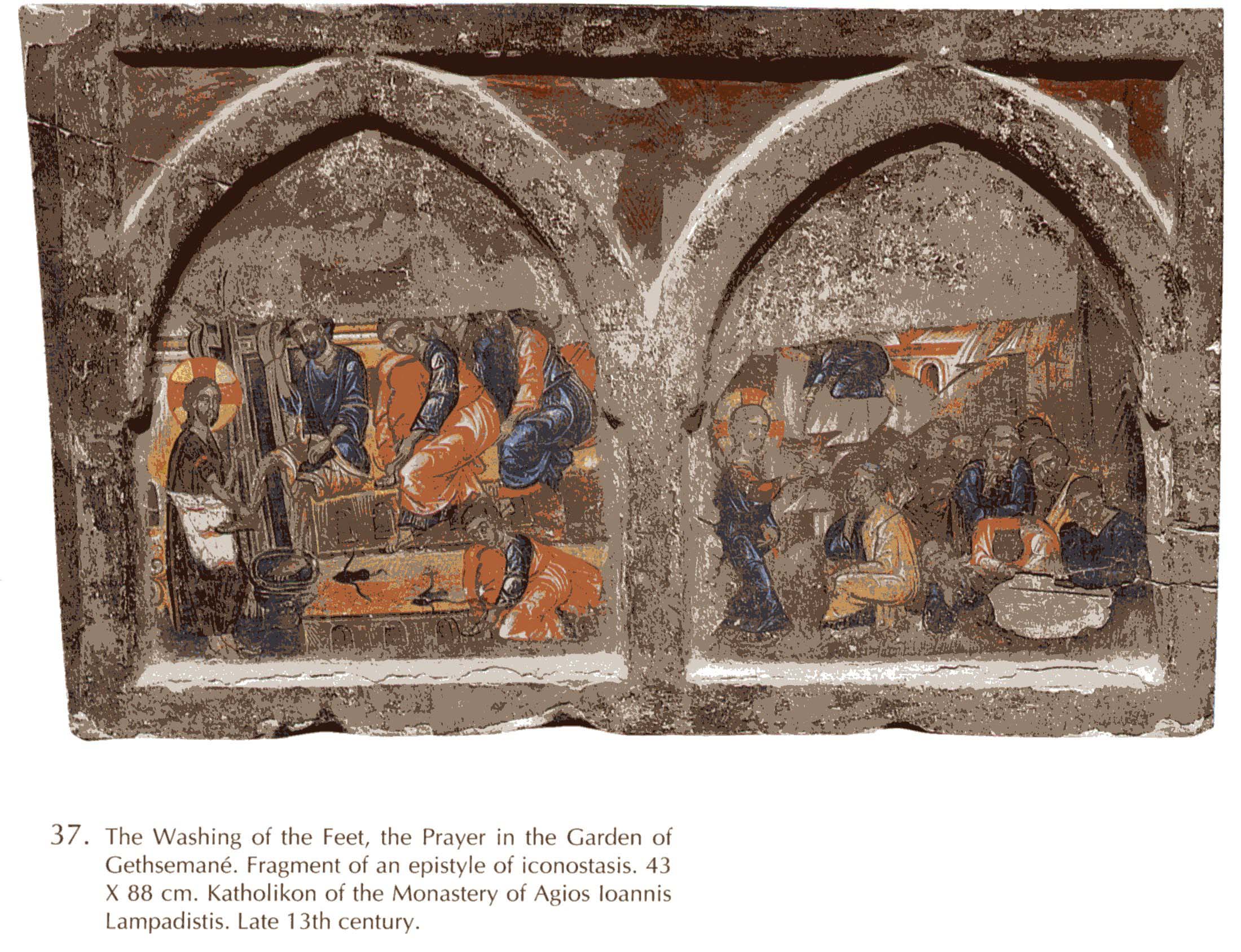 Una forte influenza occidentale è evidente nell'icona della discesa agli inferi (fig. 36) dalla chiesa principale del monastero di san Giovanni Lampadistis. L'iconografia del simbolo segue da vicino i modelli bizantini, ma la forma delle corone di Davide e Salomone sono del tutto occidentali. Inoltre, gli occhi erranti e il carattere anticlassico del dipinto sono simili a quelle delle cosiddette icone Crociate. D'altra parte la modellazione delle figure e la resa delle pieghe delle vesti sono completamente diverse da quelle delle icone del Crociato e sottolineano la tradizione bizantina. Un frammento di un architrave di una iconostasi del monastero di san Giovanni Lampadistis, è anche legato a questa icona. Su questo frammento in due archi in rilievo, a sesto acuto, sono rappresentate scene della Passione: la Lavanda dei piedi e la preghiera nel giardino del Getsemani (fig. 37). La metà superiore di entrambe le scene è stata distrutta, ma la metà inferiore è ben conservata. Vi è, in entrambe le scene, sproporzione delle teste e corpi e la sporgenza delle pupille e iridi degli occhi come nell'icona della discesa agli inferi. Nonostante questi dettagli a causa di influenza occidentale è evidente la consapevolezza delle innovazioni paleologhe. Due altre icone possono essere datate al 13 ° secolo. Entrambi raffigurano la Crocifissione. La prima (fig. 38) è sul lato opposto della Kallionitissa icona della Vergine nella chiesa di Agia Anna a Kalliana e l'altra è sul lato opposto della Vergine dipinta da loannikios nel 17 ° secolo, nella Chiesa di Panagia Katholiki a Pelendri. Le teste piuttosto sproporzionate e i corpi tozzi soprattutto sul icona di Pelendri assieme al forte carattere anticlassico sono caratteristiche frequentemente presenti nel 13 ° secolo. Inoltre lo sfondo dell'icona nella chiesa di Agia Anna a Kalliana è rossa e l'aureola viene definita con una linea tratteggiata come in molte icone nel Monastero di Santa Caterina sul Monte Sinai attribuite alle diverse botteghe dei crociati in Terra Santa. Anche se l'icona è gravemente danneggiata il volto di San Giovanni è ben conservato ed è utile per lo studio dello stile dell'icona. La Crocifissione di Kalliana è superiore alle icone dei crociati ed è intrisa della spiritualità della vera tradizione bizantina. Tra le altre icone del 13 ° secolo, deve essere ricordata l'icona processionale di san Sergio e Bachos nella Chiesa dedicata a loro aL Kalapanagiotis. Cipro è stata amministrativamente tagliata fuori da Bisanzio dopo che fu conquistata dai Franchi. Vi è, tuttavia, una ricca eredità di eventi documentati che indicano che i contatti continuato. Ad esempio nel 1223 il vescovo di Soli, Leonzio e l'abate del monastero di Apsinthion, Leonzio ha condotto una missione di Nicea. Nel 1222 e il 1240 l’Arcivescovo Neophytos fu costretto a lasciare Cipro. Nel 1231 il martirio dei 13 monaci del monastero di Kantara ha portato allo scambio di lettere tra il Patriarca di Costantinopoli Germanos e il Papa Innocenzo. C'era anche la corrispondenza tra il re Lusignano di Cipro, Enrico I e l'imperatore John Vatatzis. Un altro esempio è il viaggio di Gregorio di Cipro prima a Smirne e a Nicea e poi a Costantinopoli dove fu ordinato patriarca. E' chiaro che esistevano tutti i canali di comunicazione del 13 ° secolo con Bisanzio ed è a questo fatto che si può attribuire l'influenza della pittura di Bisanzio sulle icone cipriote di questo periodo. I contatti tra il clero di Cipro e di Costantinopoli sono diventati più stretti, nonostante la sottomissione obbligatoria della Chiesa ortodossa di Cipro alla Chiesa latina, dopo l'emissione della Cypria Bulla di papa Alessandro IV nel 1260. Molti monaci ciprioti ed ecclesiastici si recarono a Costantinopoli e alcuni di loro si sono stabiliti lì facendo carriera nel Patriarcato e almeno uno di essi, l’Antipalamite [Gregorio Palamas] Giacinto è stato ordinato vescovo di Tessalonica. Sulle monaci D'altra parte i monaci dal Monte Athos monte e da Costantinopoli, come San Savvas in Nuovo, hanno visitato Cipro, dove rimasero per periodi più o meno lunghi. La questione esicastica scoppiata durante questo periodo ha portato i sacerdoti e i laici di Costantinopoli più vicini al clero e al popolo di Cipro. Gli antipalamiti in crescita anche più vicini a Cipro. Niceforo Gregora e Demetrio Cydones sono stati in corrispondenza con Giorgio Lapithes e altri avversari di esicasmo a Cipro. Altri avversari di Palamas, come Agathangelos di Callistratos, Anthimos, Atouemis Kouvouklaris, Ignazio Patriarca di Antiochia, John Kyparissiotis e il vescovo di Cirillo si rifugiarono a Cipro. Non solo gli avversari ma i sostenitori di Palamas hanno avuto anche contatti in Cipro. Così John Cantakouzenos scrisse una lettera a Giovanni, vescovo di Carpassia e Famagosta, mentre il patriarca di Costantinopoli Kallistos si rivolse al clero e al popolo di Cipro nel 1361 o 1362. Il Patriarca li ha elogiati per il loro attaccamento alla fede ortodossa e consigliato loro, cercando di proteggerli dalle attività del legato pontificio Thomas e dell’Antipalamide ignazio Patriarca di Antiochia che sono stati poi a Cipro. Monaci ciprioti, d'altra parte, che hanno visitato Costantinopoli hanno chiesto a Giuseppe Kalothetos sull’esicasmo. I monaci ciprioti che hanno visitato Costantinopoli vennero a contatto con l'Arte dei Paleologi, l’ultima rinascita dell’arte bizantina, e al loro ritorno hanno portato a Cipro icone di questo centro artistico. E 'possibile che tra questi monaci, visitando Costantinopoli, vi fossero pittori, anche se nessuna prova scritta di ciò è giunta fino a noi. Tuttavia, sappiamo di un pittore cipriota che andò a Costantinopoli per migliorare la sua arte. Questo pittore, Bailiano Catellano, è morto durante il suo viaggio di ritorno nel 1348 e fu sepolto nella Spinalonga al di fuori del Chantax (Herakleion) di Creta. Attraverso questi contatti, che sono stati intensificati dalle tem