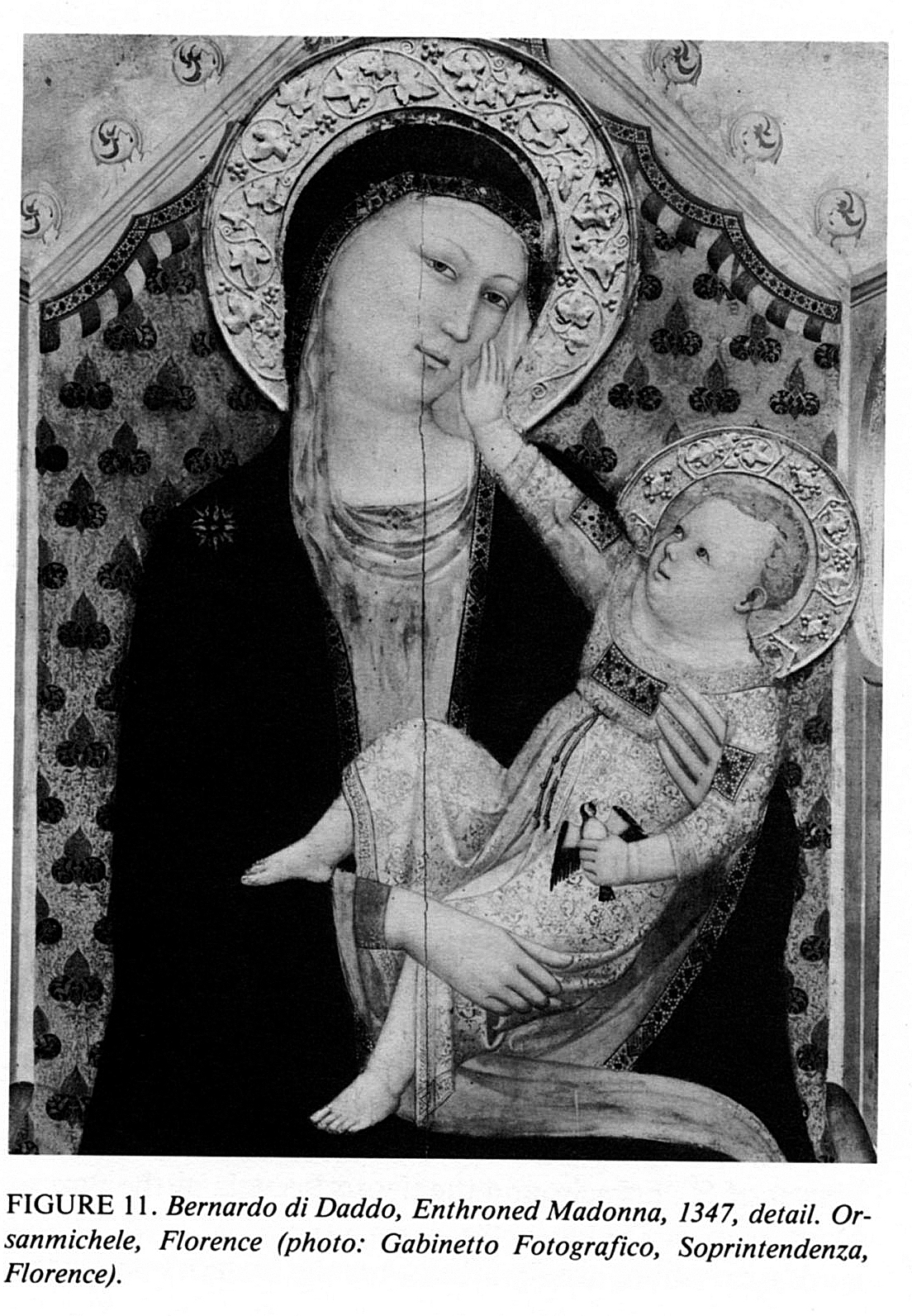 Sono perplesso per l’insorgere di una simile combinazione di fogliame di vite che scorre liberamente in pastiglia nell'aureola di una grande Madonna in trono che costituisce il centro del tabernacolo marmoreo dell'Orcagna scolpito in Orsanmichele a Firenze (Fig. 11).